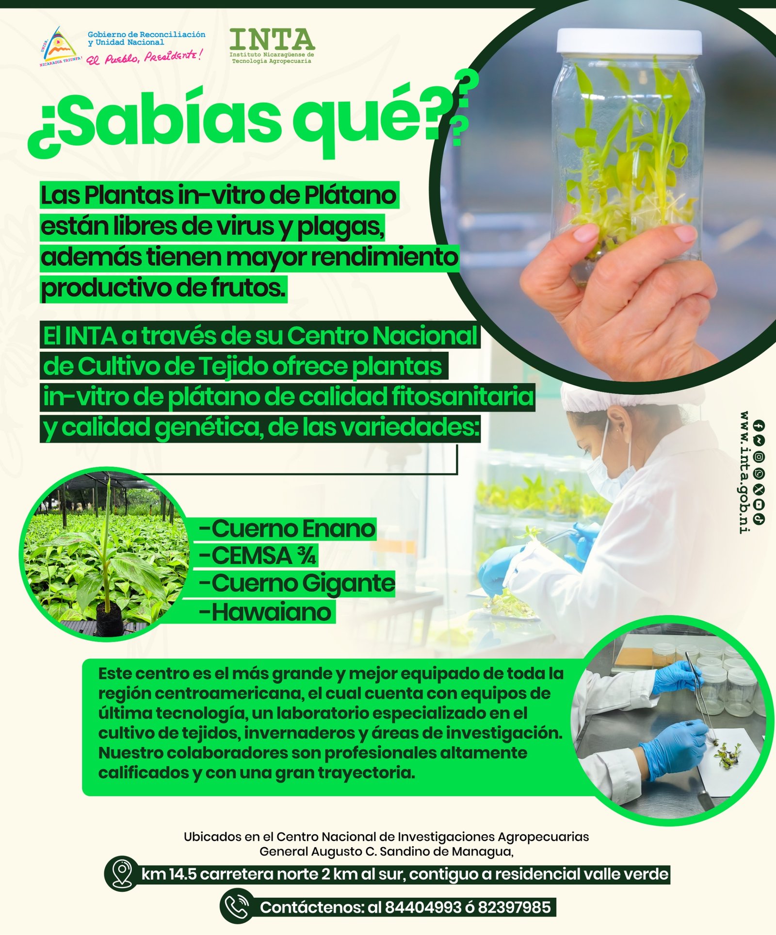 Ubicados en el Centro Nacional de Investigaciones Agropecuarias General Augusto C. Sandino de Managua, km 14.5 carretera norte 2 km al sur, contiguo a residencial valle verde