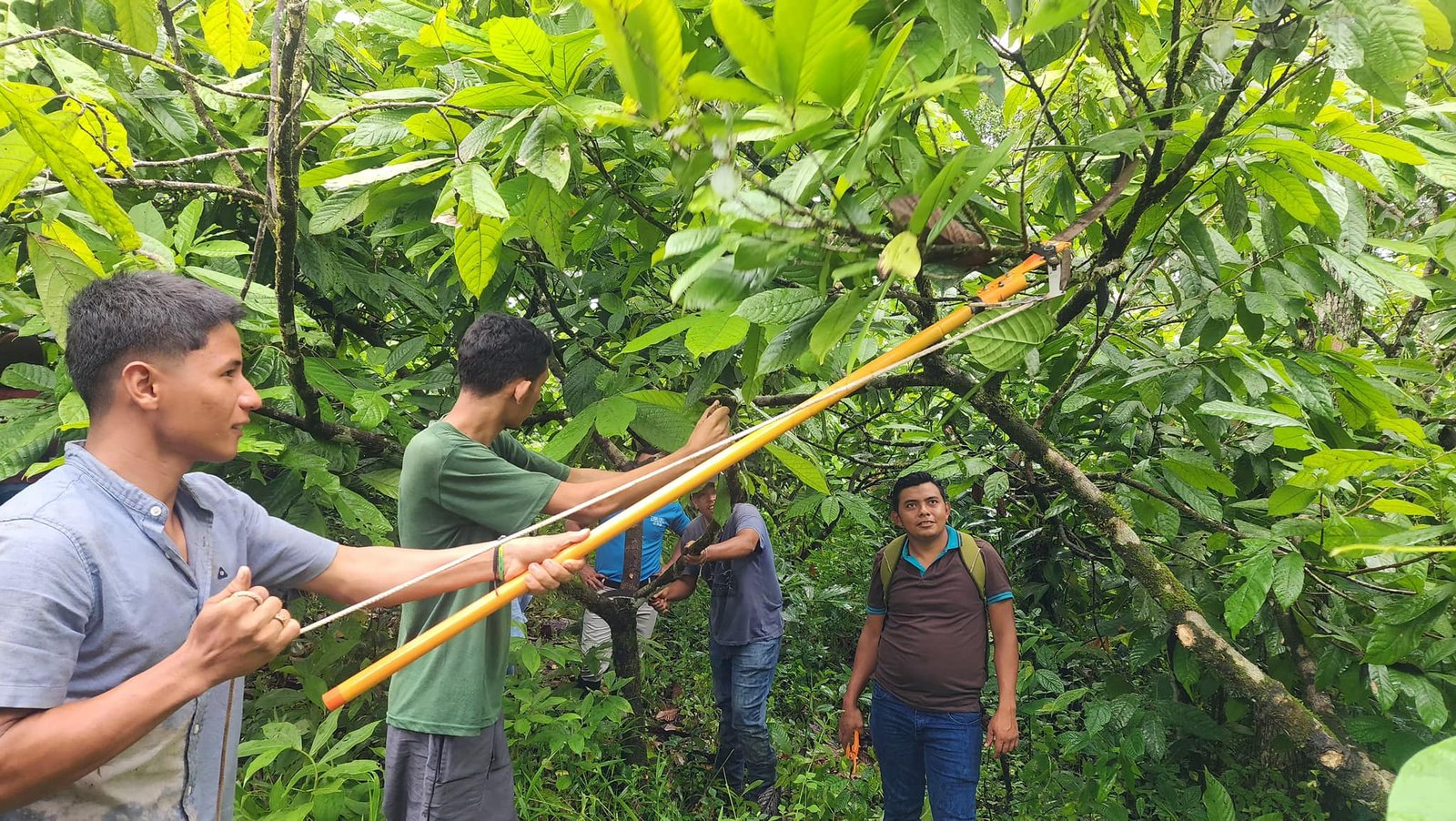 Además de la aplicación de Trichoderma, 500 gramos diluidos en 200 litros de agua en una manzana, demostración práctica de poda sanitaria, poda de regulación de sombra, y eliminación de rebrotes no deseados.
