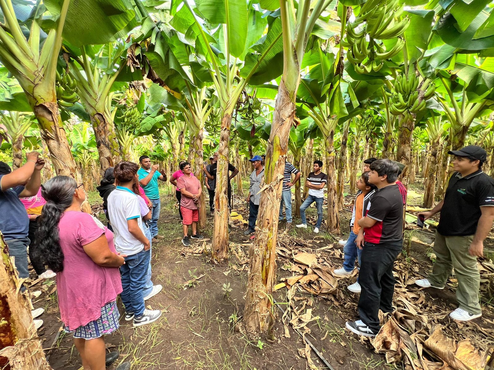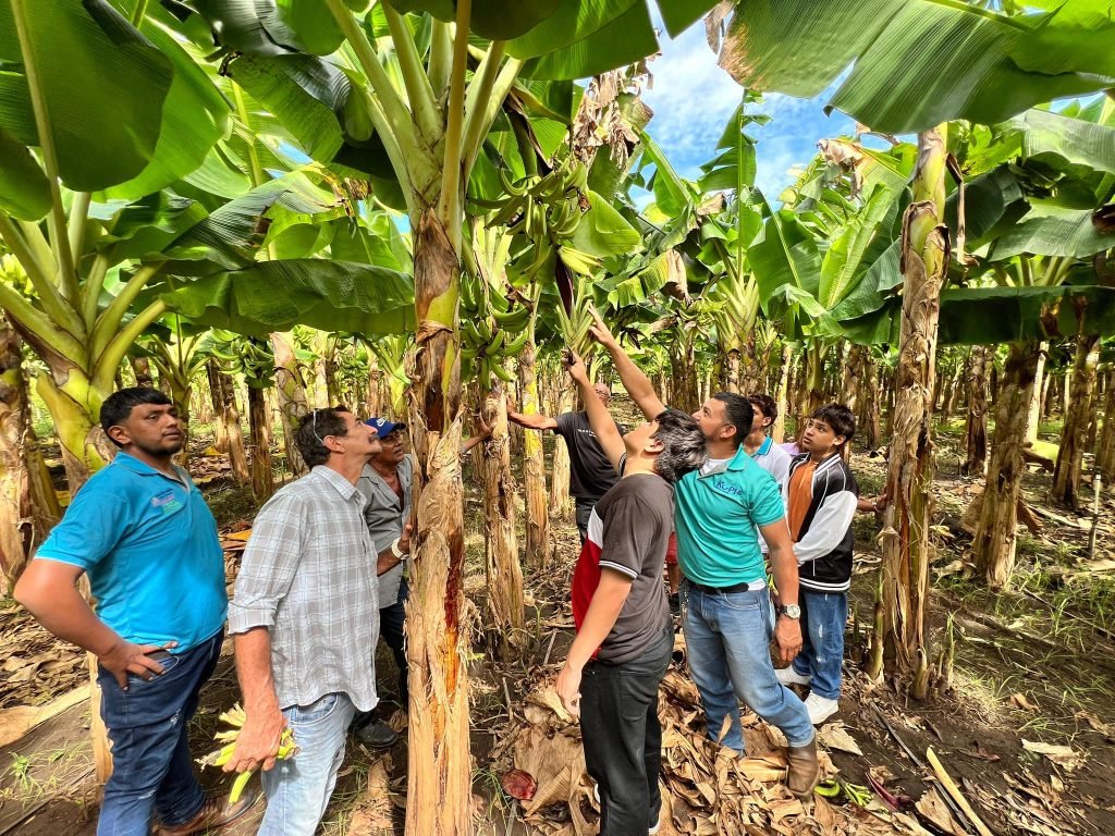 Los productores participaron de una demostración práctica en la etapa de fructificación del cultivo, haciendo desmane, que ayuda a madurar el racimo, y engrosar los últimos dedos de la cabeza de plátano.